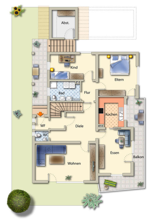 EG: Wohnen, Essen, Kochen, Eltern, Kind, Bad, Gäste-WC, Diele, Balkon, Wohnfläche ca. 100 m²